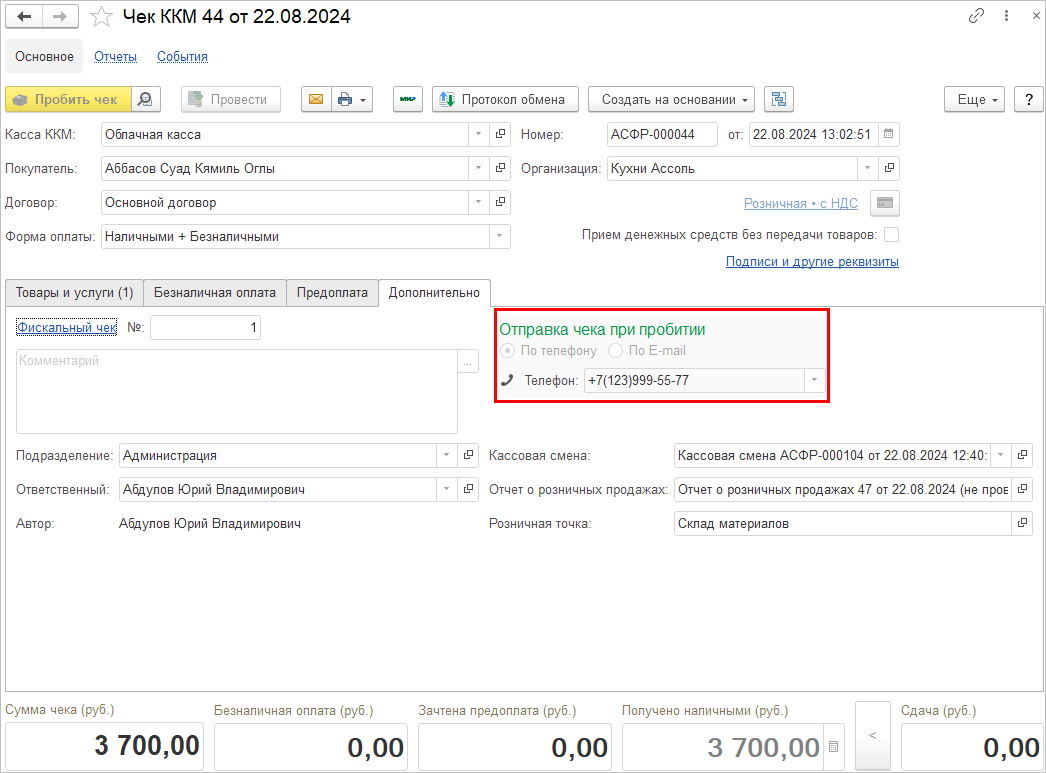 Данный сценарий предполагает работу только с электронными чеками, поэтому для пробития документа необходим телефон или E-mail покупателя. Если контактные данные указаны в карточке клиента, то в чеке они заполнятся автоматически, в противном случае контакт потребуется указать на закладке "Дополнительно" вручную.