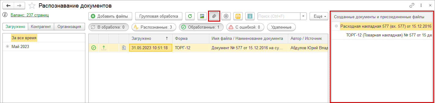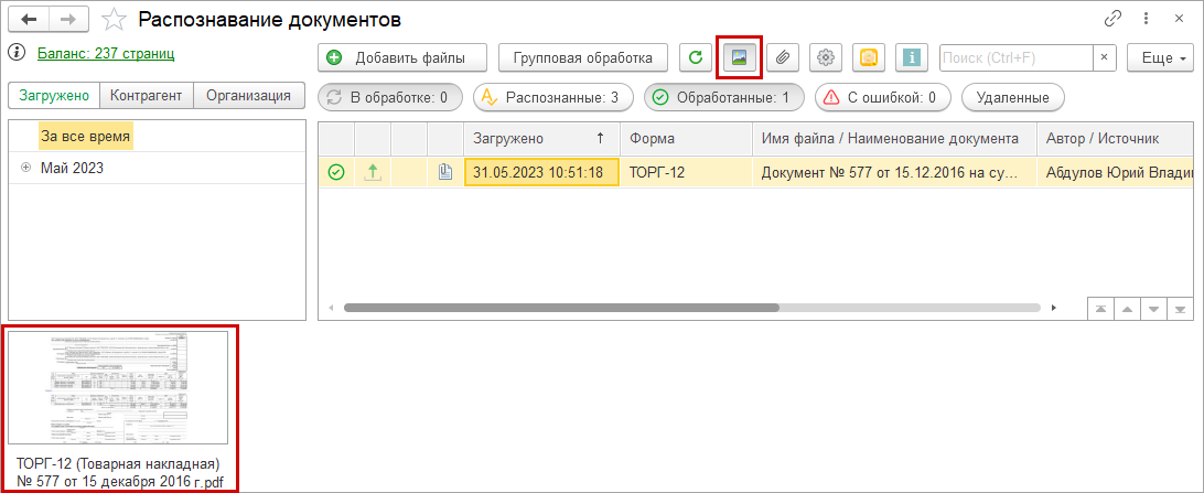 Результаты распознавания отобразятся в вашей локальной базе 1С. Их необходимо обработать и ввести по ним учетные документы, как это было писано ранее (см. Обработка документов после распознавания).