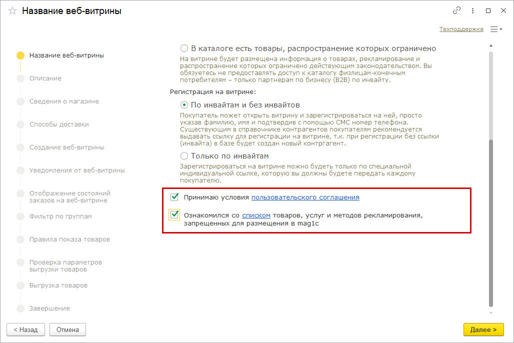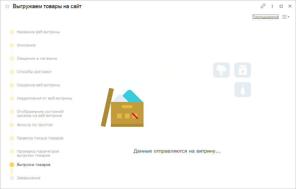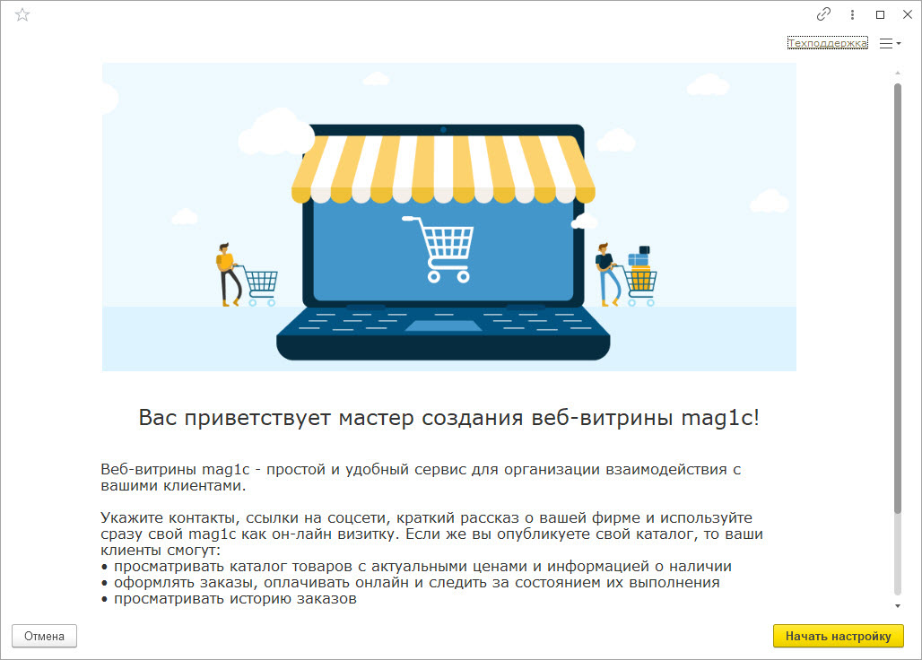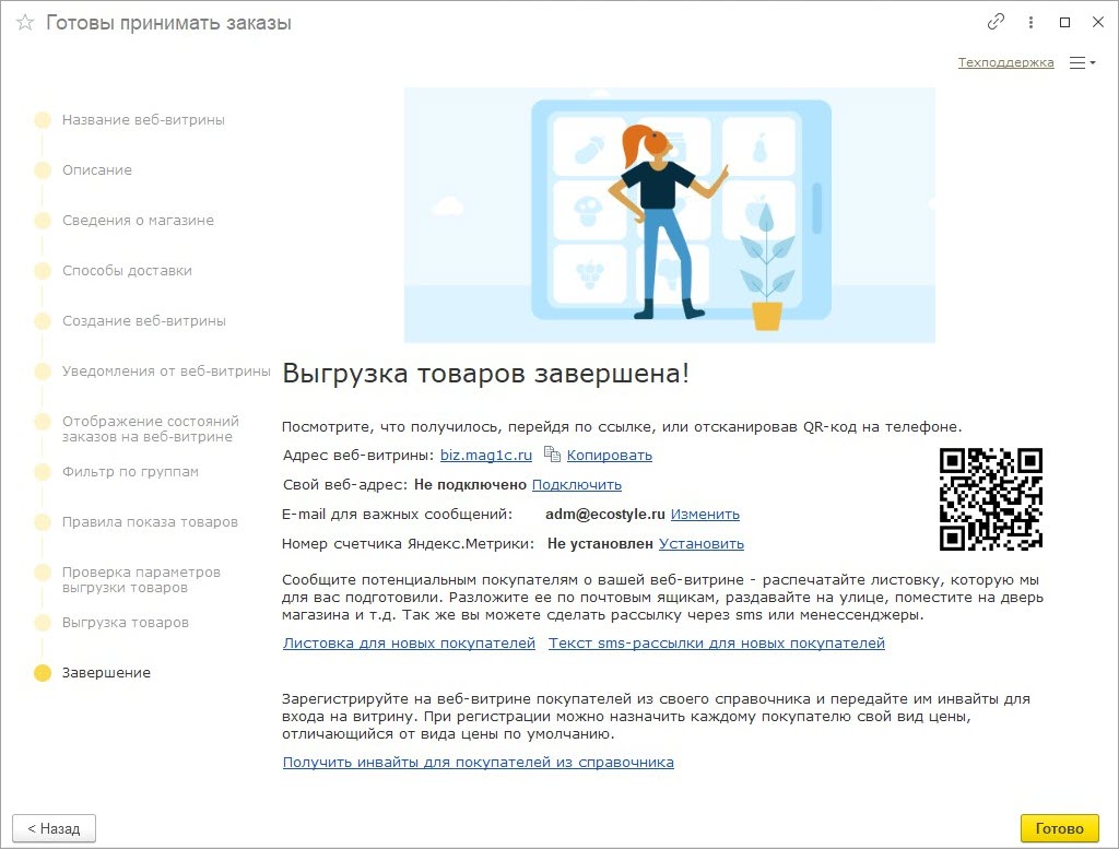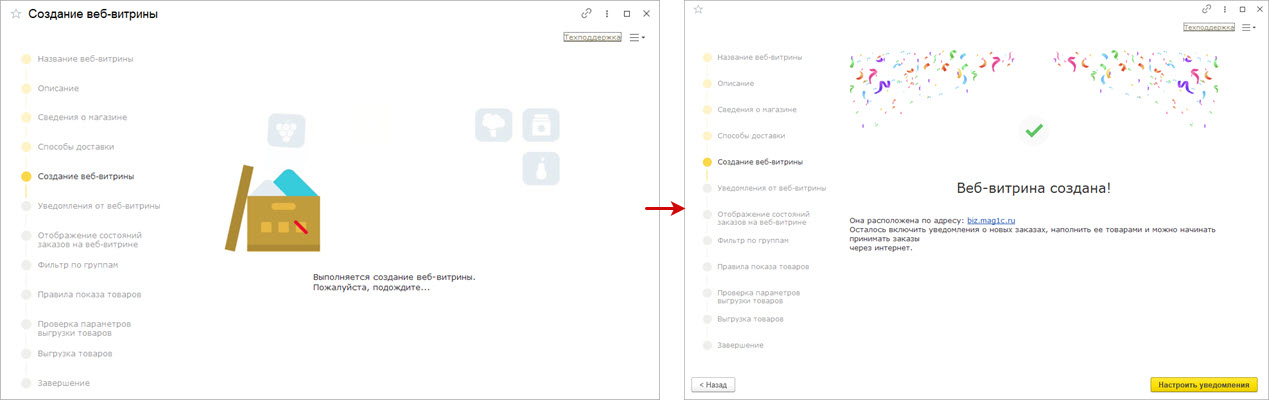 Сразу после перезапуска откроется мастер настройки веб-витрины, с помощью которого вы сможете подготовить страницу и наполнить витрину товарами.