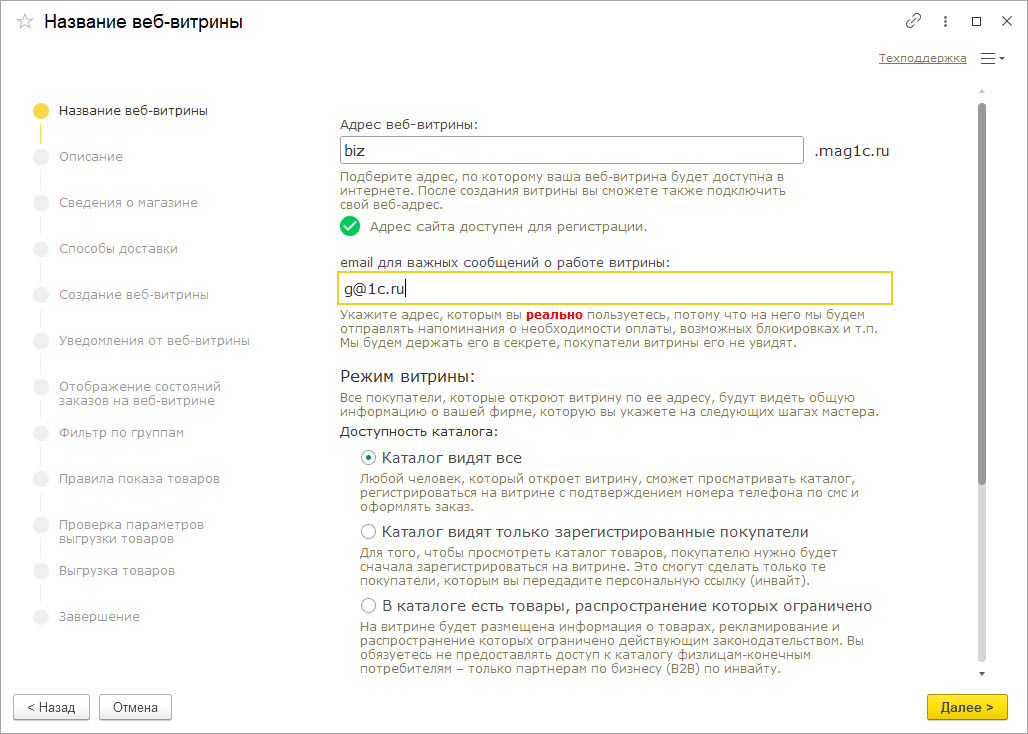 Введите адрес, по которому ваша веб-витрина будет доступна в интернете. Если адрес доступен, вы увидите зеленый флажок.