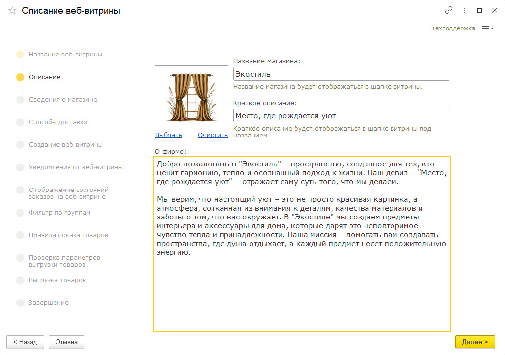 Дайте название вашей витрине, добавьте логотип и краткое описание. Нажмите "Далее".