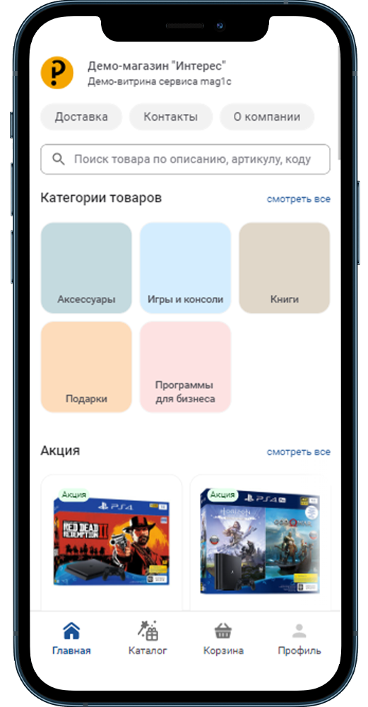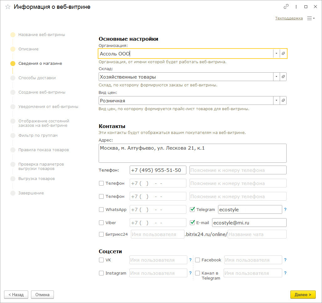 Созданная витрина пока содержит только информацию о компании, контакты и условия доставки. Чтобы наполнить ее продолжайте следовать указаниям помощника.