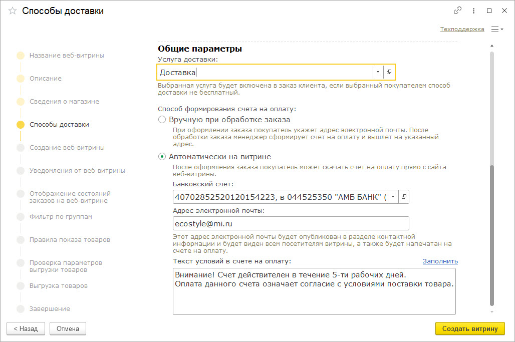 Для создания счетов на витрине добавьте счет организации, e-mail и условия действия счета.