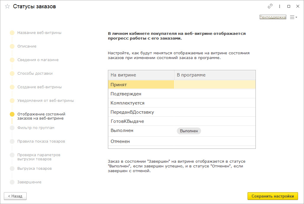 В личном кабинете витрины покупатель может видеть состояние обработки заказа. Чтобы эта информация передавалась из 1С необходимо сопоставить состояния витрины с состояниями в 1С.