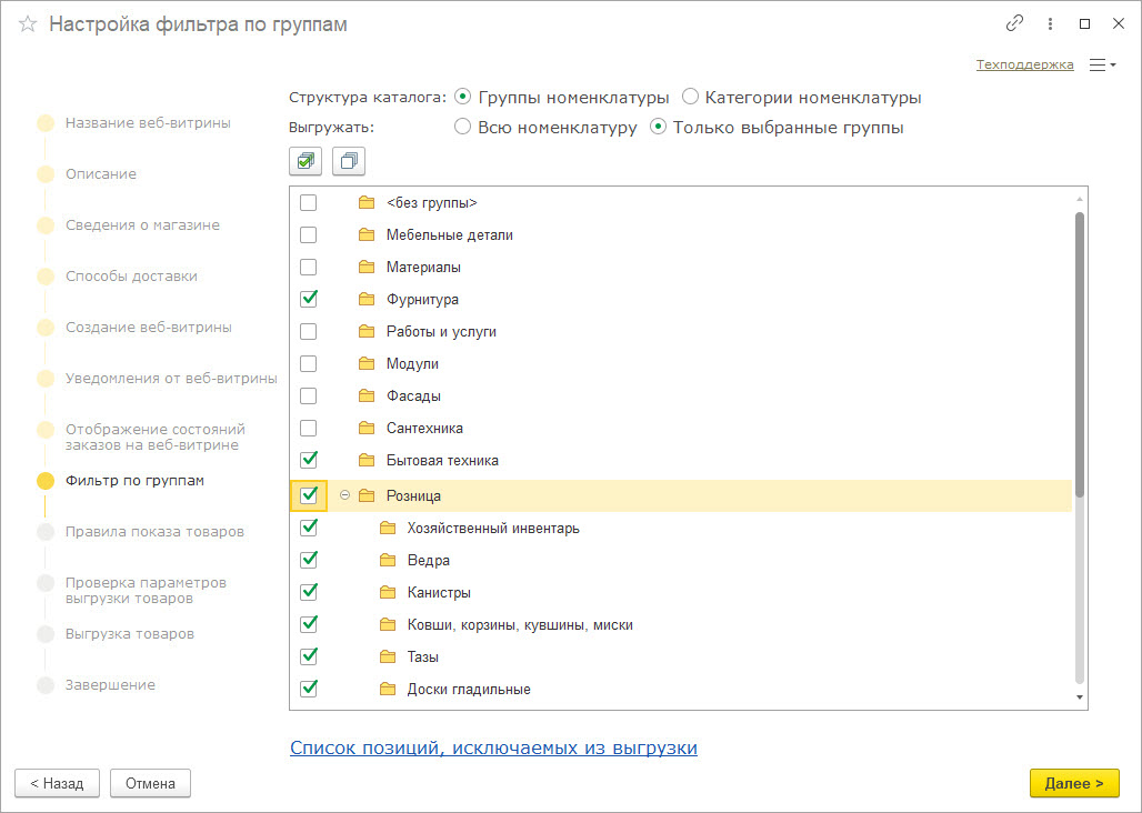 Выберите группы или категории товаров для выгрузки.