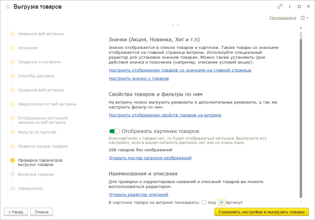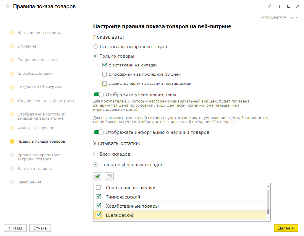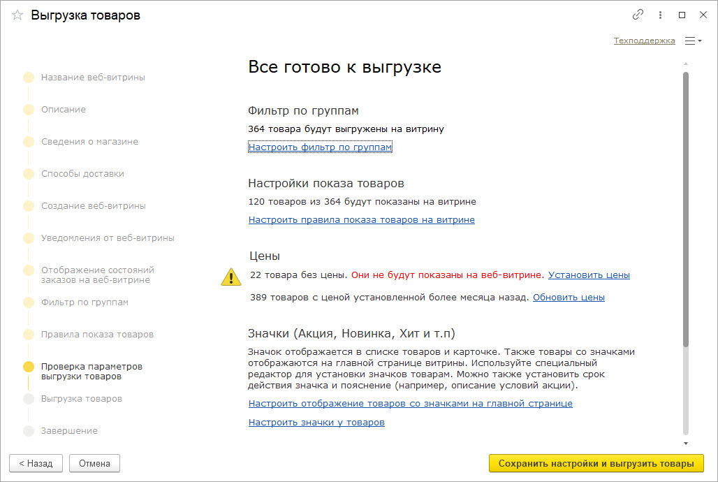 Проверьте результаты настройки. Помощник подскажет, какие товары не будут показаны на витрине из-за отсутствия остатков или цен.