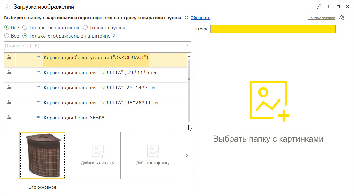 Если в вашем каталоге мало изображений, можно отключить их показ на витрине. Также можно добавить новые изображения, установить основные и дополнительные с помощью мастера загрузки.
