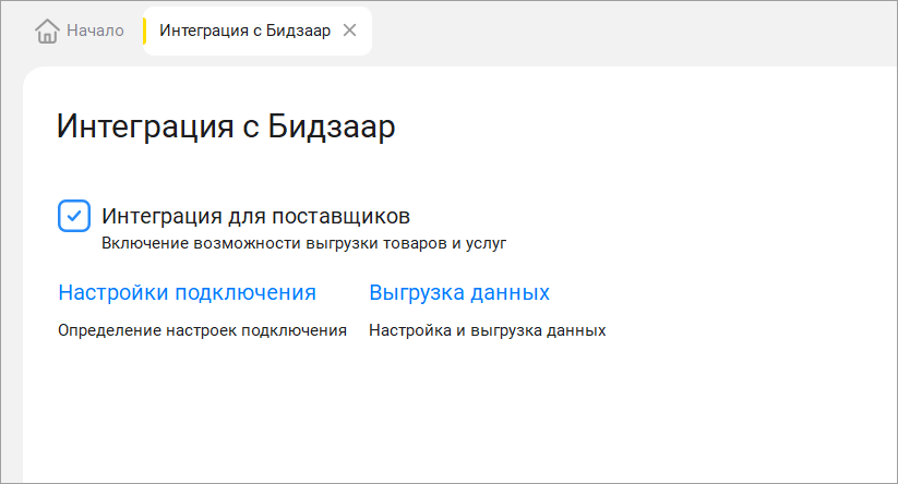 Перейдите в раздел Настройки - Интеграции - Интеграция с Бидзаар. Установите флажок "Интеграция для поставщиков", затем нажмите "Настройки подключения".