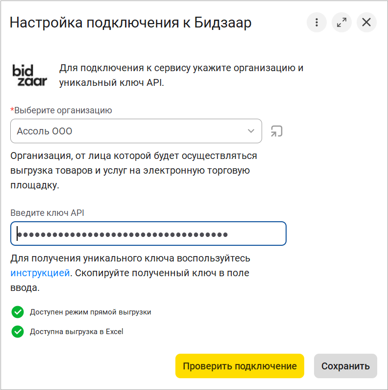 Выберите организацию, от лица которой будет осуществляться выгрузка товаров и услуг на торговую площадку. Затем введите ключ API. Получить ключ можно по инструкции, которую можно найти ссылке под полем ввода. Нажмите "Проверить подключение".