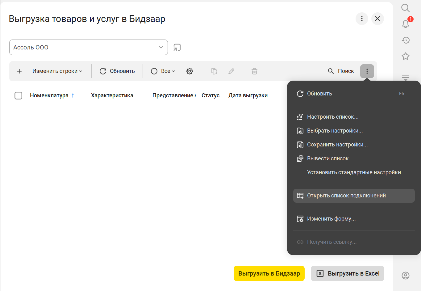 После проверки перейдите по ссылке "Выгрузка данных" в разделе "Интеграция с Бидзаар". Отобразится рабочее место для выгрузки товаров и услуг. Если вы подключаете интеграцию для нескольких компаний, переключаться между организациями можно через поле ввода наверху формы, а настраивать - в меню с тремя точками по команде "Открыть список подключений".