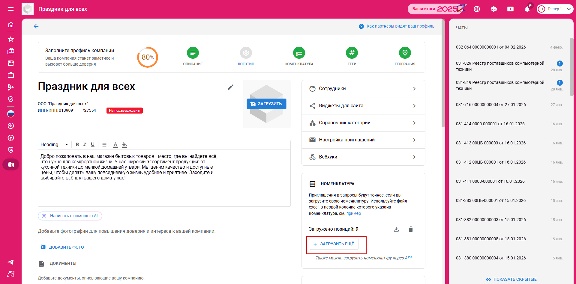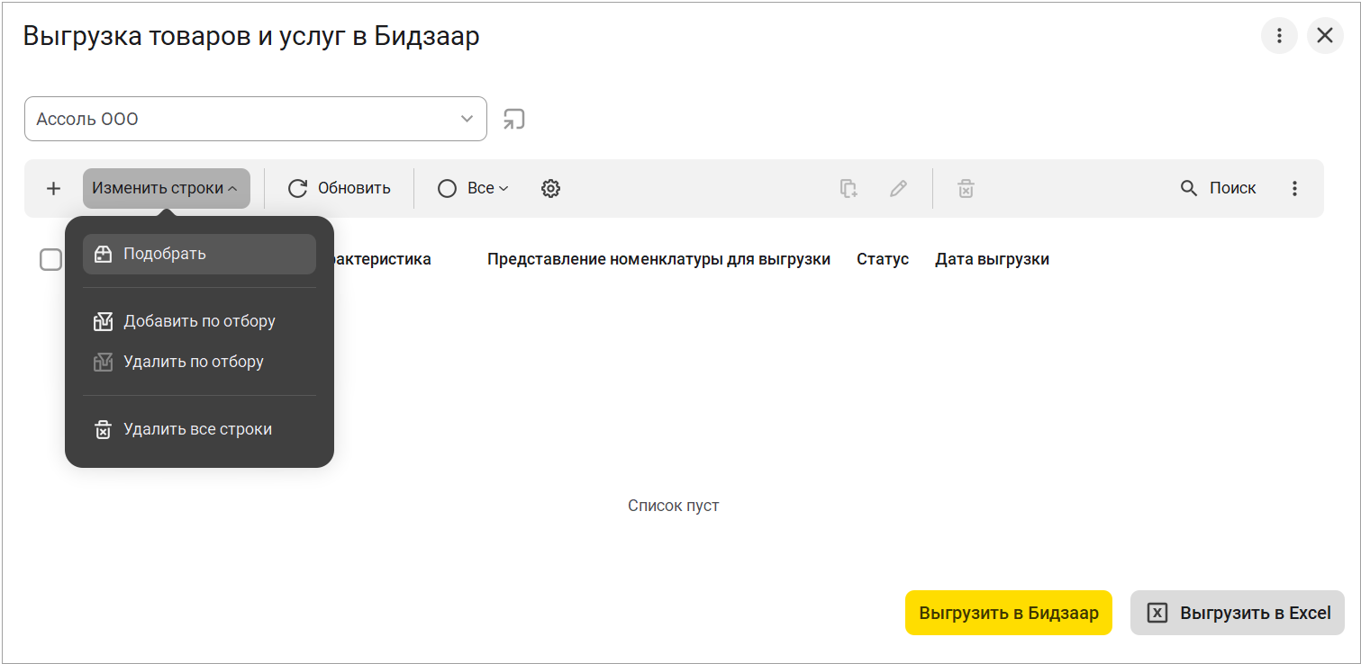 По кнопке "Выгрузить в Бидзаар" товары и услуги будут выгружены на площадку. По кнопке "Выгрузить в Excel" вы сможете скачать файл со списком и загрузить его в профиль компании по кнопке "Загрузить еще".