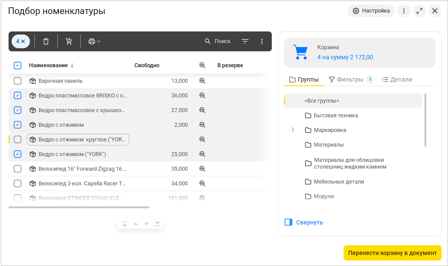 Отметьте флажками позиции, которые требуется перенести в корзину. Перенесите товары в корзину по одноименной кнопке с изображением тележки. Нажмите "Перенести корзину в документ".