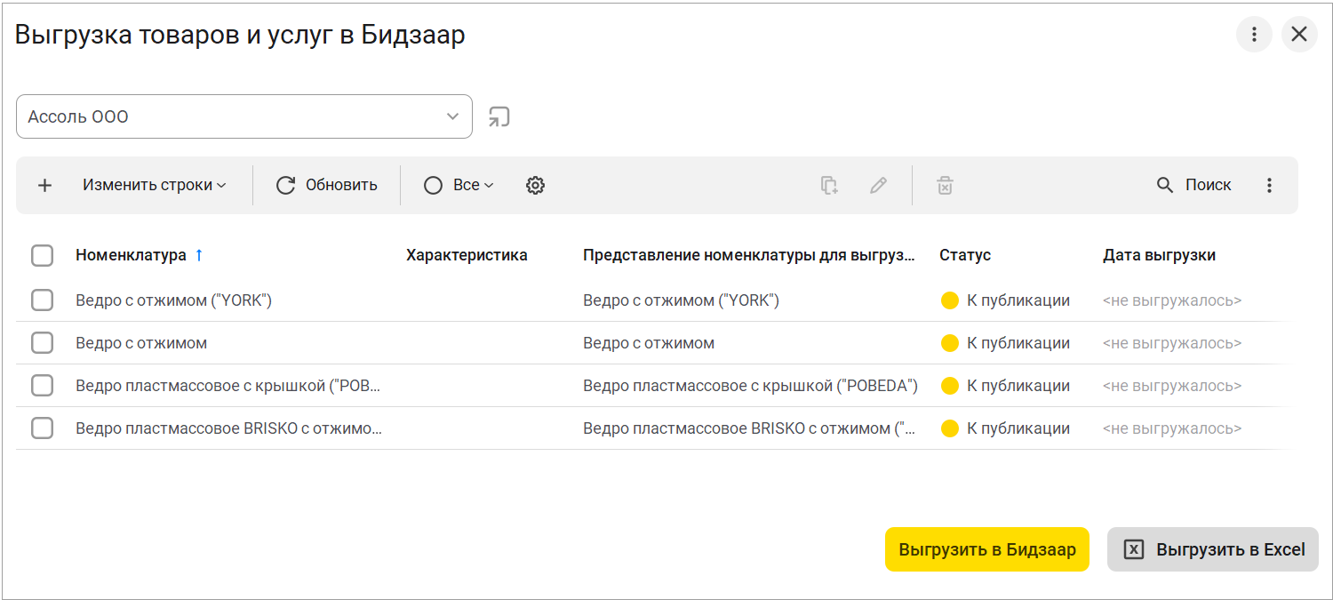 В списке отобразится номенклатура, вариант представления номенклатуры, а также статус и дата выгрузки. Далее из списка можно выгрузить товары напрямую в Бидзаар или в Excel по одноименным кнопкам.