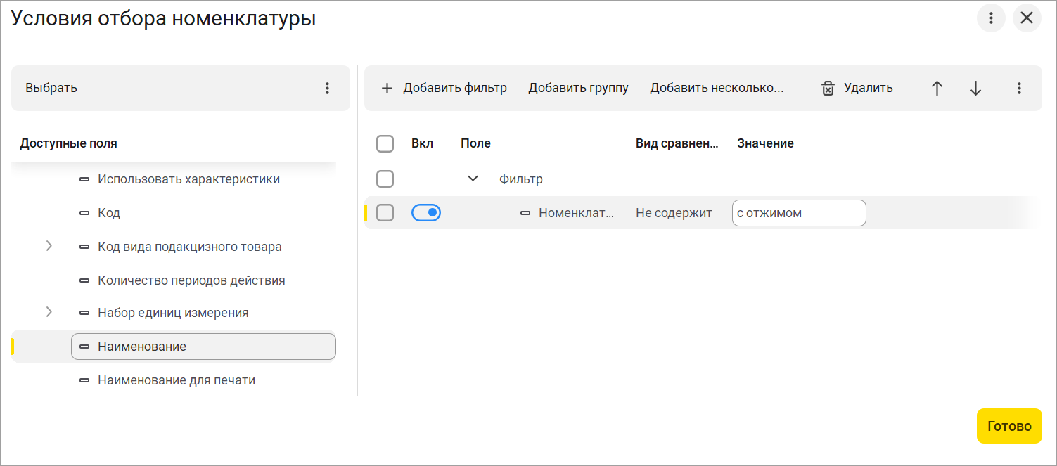 Также по кнопке "Изменить строки" по командам "Добавить по отбору" и "Удалить по отбору" можно настроить принцип отбора или удаления, если требуется выгрузка большого количества товаров и услуг.