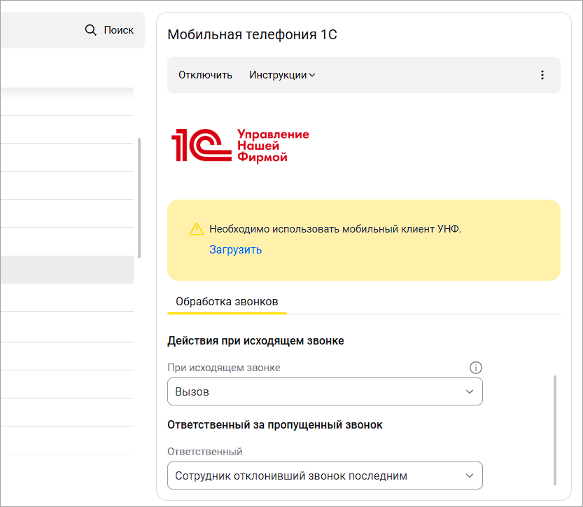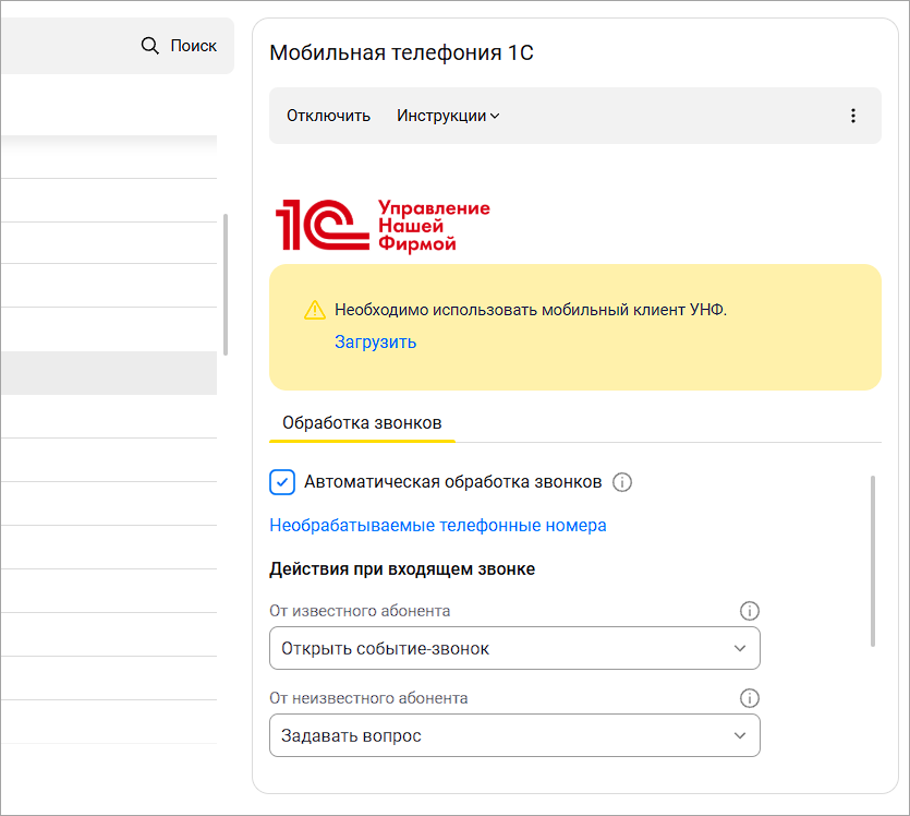 Для работы мобильной телефонии в 1С нужно использовать мобильный клиент УНФ, доступный в любом магазине приложений или на сайте releases.1c.ru: