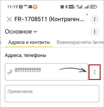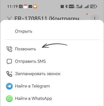 Откройте карточку контрагента, возле поля с номером телефона нажмите на три точки и выберите "Позвонить".