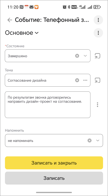 По завершении звонка запустите мобильное приложение 1С:УНФ. Исходящий звонок будет обработан согласно настройкам: откроется событие для записи деталей разговора или карточка контрагента.