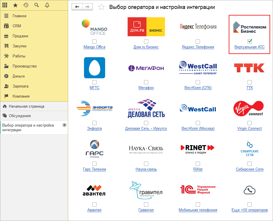 В открывшемся окне выберите Виртуальную АТС от Ростелеком Бизнес, установив флажок.
