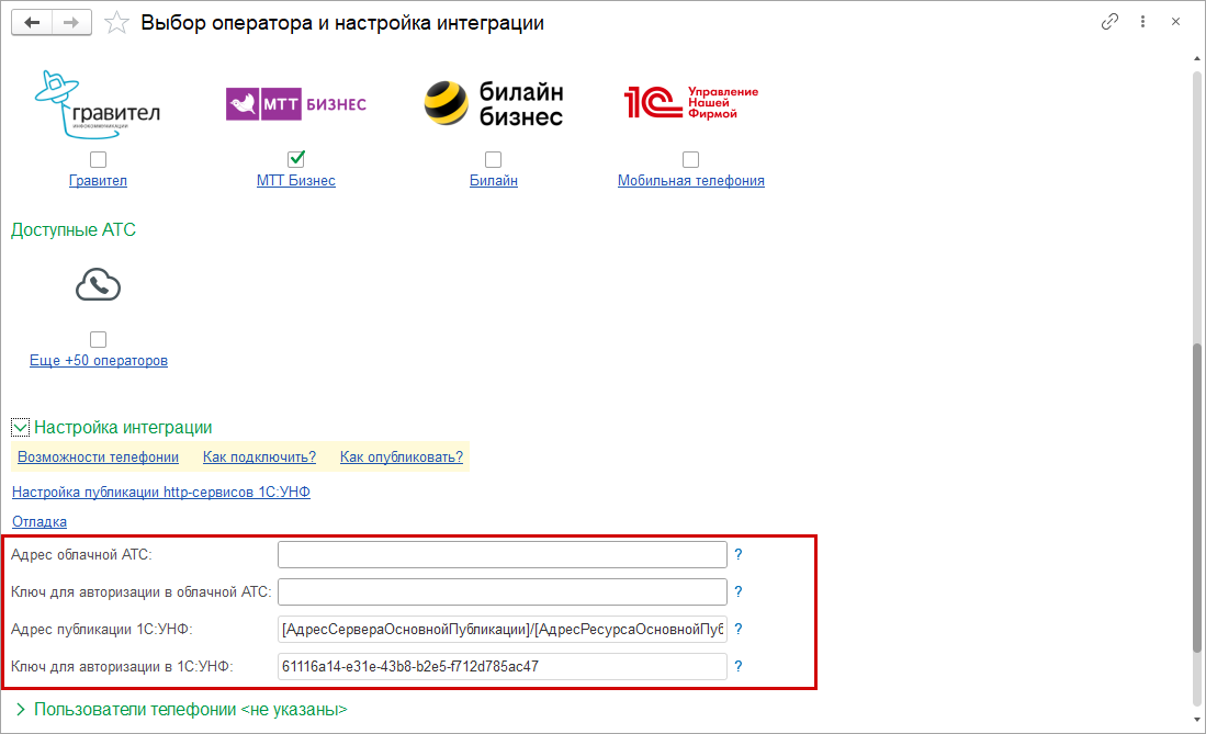 Заполнение настроек пользователей телефонии обязательно для соединения с облачной АТС. Данные о пользователях в 1С:УНФ должны соответствовать данным, указанным в личном кабинете оператора.
