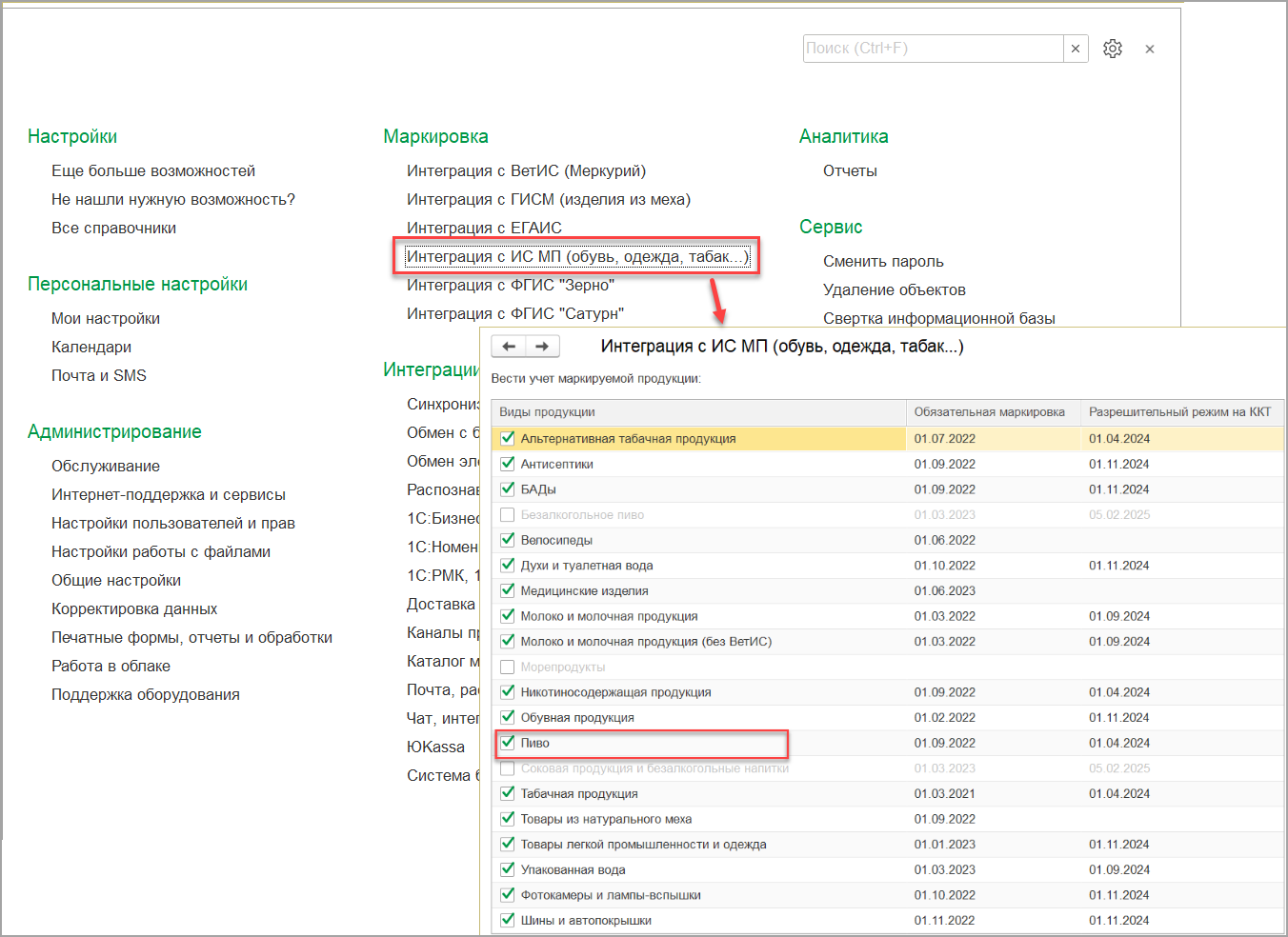 Открываем настройку Интеграция с ИС МП (одежда,обувь,табак...) и устанавливаем флажок Пиво.