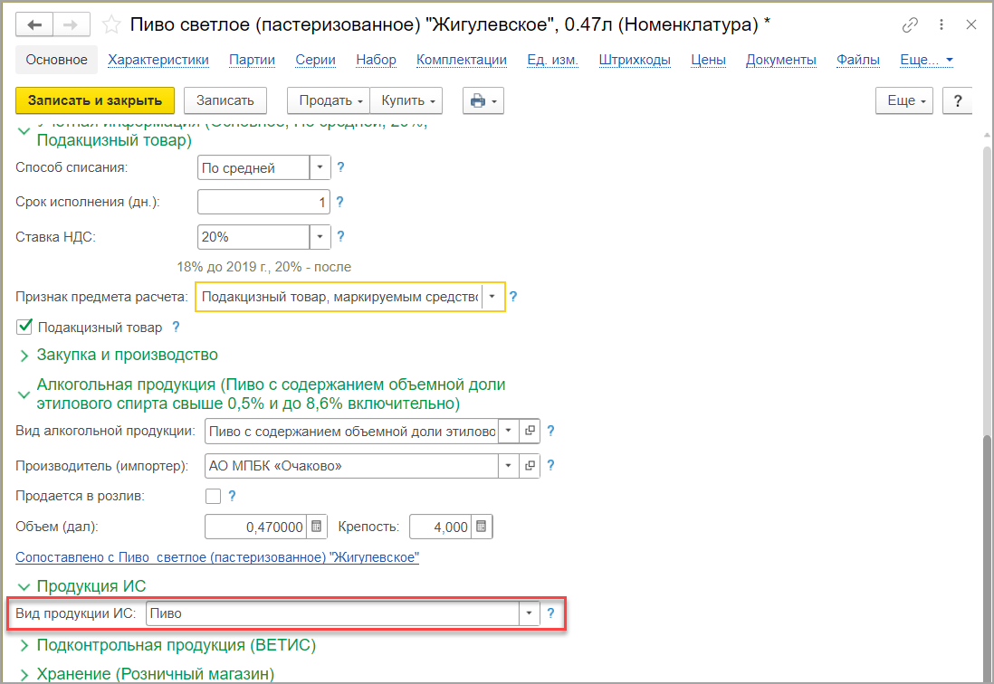 Обратите внимание, что при продаже пива оптом необходимо использовать УПД формата 5.02 и проверять заполнение "вида продукции ИС" в карточках товаров.