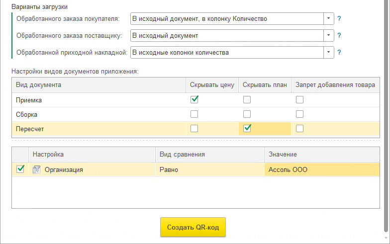 Блок "Настройки видов документов" приложения позволяет по каждому из видов документов ограничить отображение данных по ценам, плановых (ожидаемых) данных и запретить добавление товара, отсутствующего в исходном документе