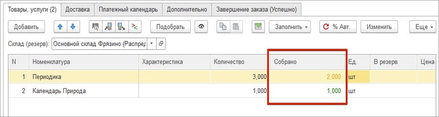 Обработанная строка уйдет со страницы "К сборке" и отобразится на странице "Собранные". Если для товара было указано фактическое количество, отличающееся от планового, то такая строка будет выделена красным цветом.