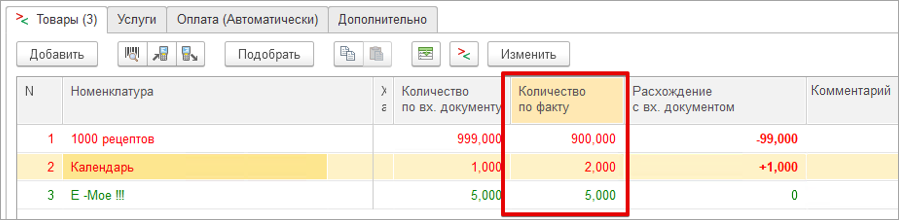Укажите фактическое количество каждого из отображенных товаров. Ввод фактических данных осуществляется одним из следующих способов: