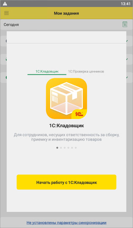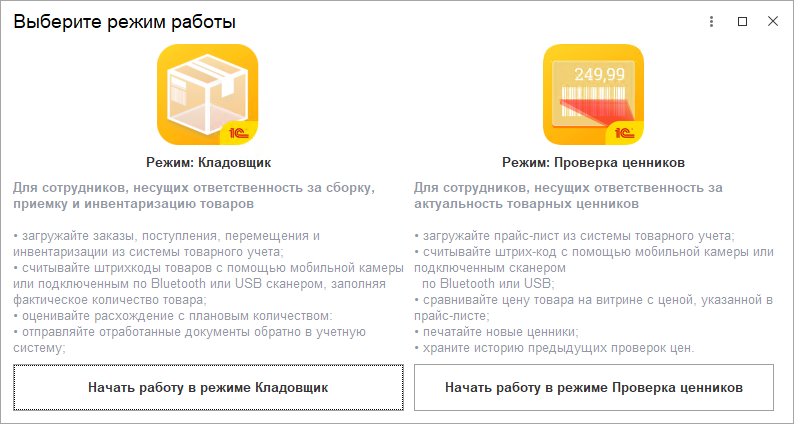 Нажмите на кнопку "Подключиться" – откроется окно выбора режима дальнейшей работы: выберите "1С:Кладовщик" и нажмите на кнопку "Начать работу".