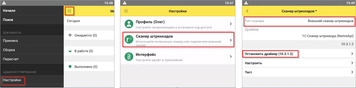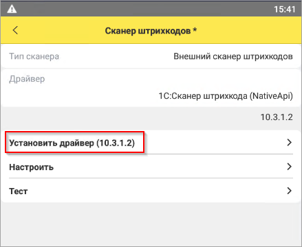 В поле "Тип сканера" выберите "Внешний сканер штрихкодов" и нажмите кнопку "Установить драйвер".