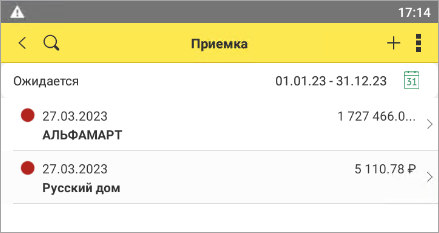 Нажмите на строку "Приемка" в разделе "Ожидается". В открывшемся списке выберите нужный документ.