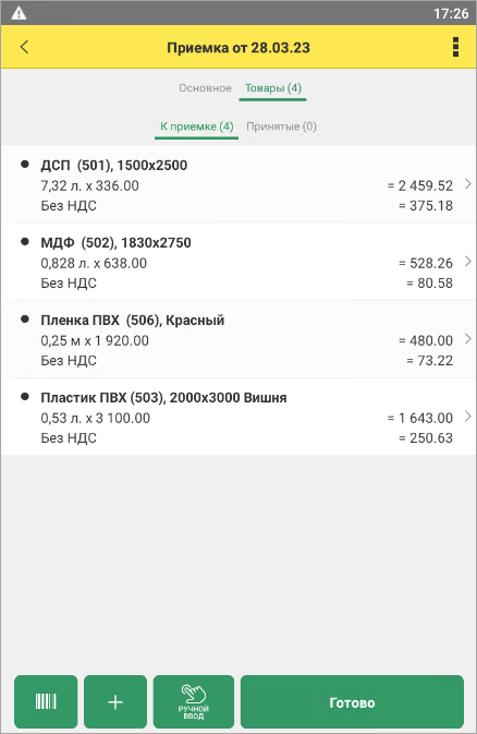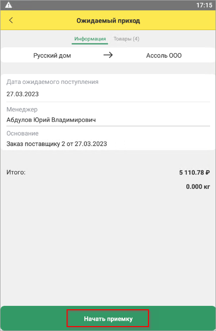 В форме просмотра плановых данных ознакомьтесь с реквизитами шапки и плановыми товарными данными на странице "Товары", после чего нажмите кнопку "Начать приемку".