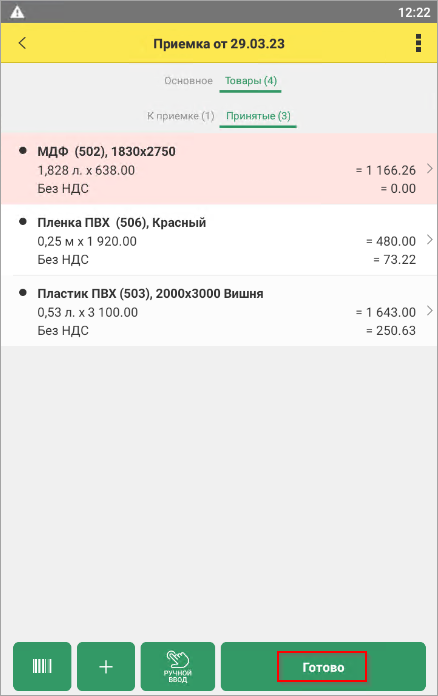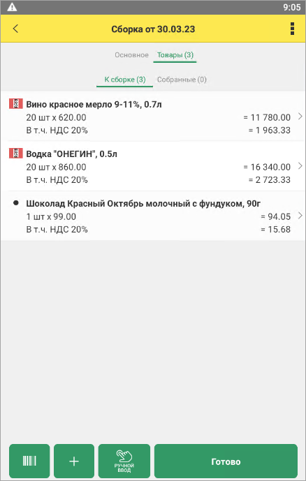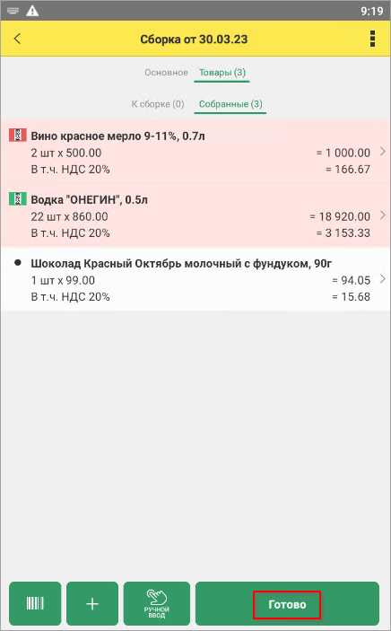 Когда решите завершить подбор товаров в документ, нажмите кнопку "Готово".