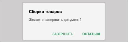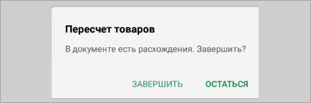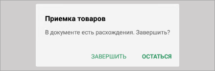 В ситуации, когда фактическое количество некоторых товаров отличается от планового, будет выдан дополнительный запрос на подтверждение действия, поскольку после завершения документ станет недоступным для дальнейшего редактирования.