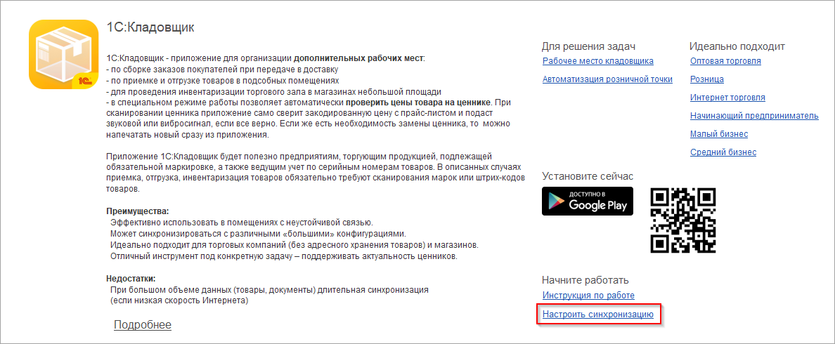 В открывшемся списке найдите приложение "1С:Кладовщик" и перейдите по гиперссылке Настроить синхронизацию.