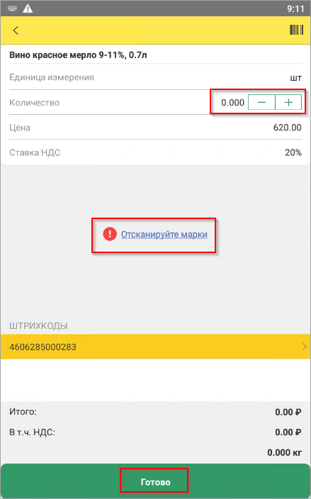 Если товар является маркированной продукцией, то здесь будет информация о считанных марках, причем в этом случае введенное количество товара будет требовать считывания такого же количества марок.