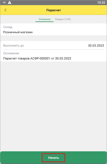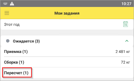 После успешного обмена в разделе "Мои задания" мобильного приложения отразится документ "Пересчет" со статусом "Ожидается".