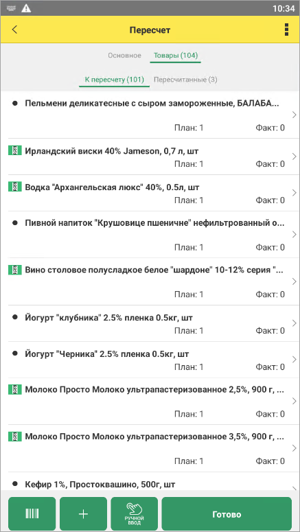 На открывшейся странице "Товары" будут показаны плановые данные о товарах, загруженные из документа управляющей системы. Укажите фактическое количество каждого из отображенных товаров.
