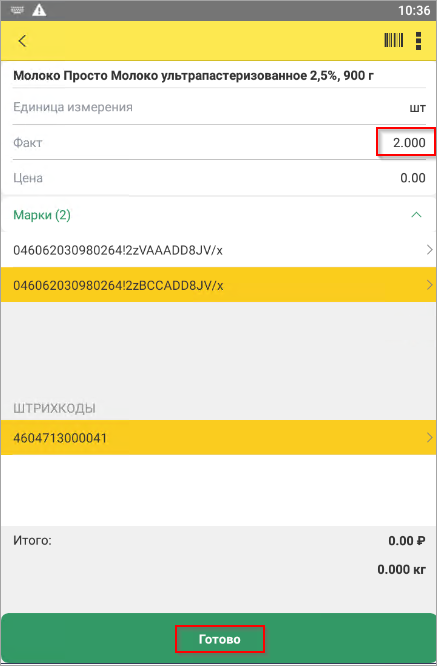 Здесь же будут отображены штрихкоды, привязанные к этому товару. Если товар является маркированной продукцией, то дополнительно будет показана информация о считанных марках, причем в этом случае введенное количество товара будет требовать считывания такого же количества марок.