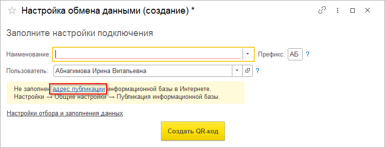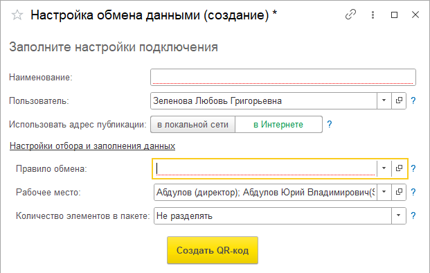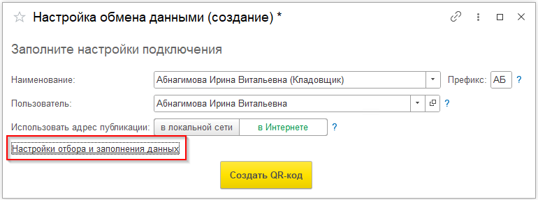 После заполнения обязательных полей в новой настройке обмена данными нажмите на кнопку "Создать QR-код".