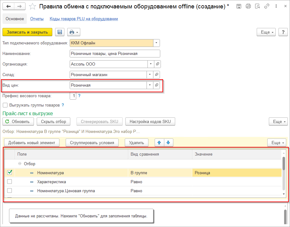 При создании правила обмена обязательно укажите вид цен, который будет отражаться на ценниках, при необходимости укажите налагаемые на справочник условия отбора в таблице компоновки данных.