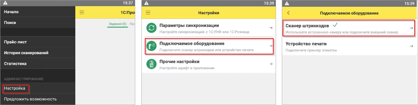 Для подключения сканера откройте пункт главного меню Настройки - Подключаемое оборудование и выберите "Сканер штрихкодов".