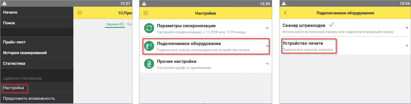 Для подключения принтера в меню "Настройки" – "Подключаемое оборудование" выберите "Устройство печати".