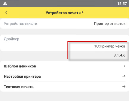 В поле "Устройство печати" выберите "Тип устройства печати" – "Принтер этикеток". Для устройства определится "Драйвер" – "1С:Принтер чеков".