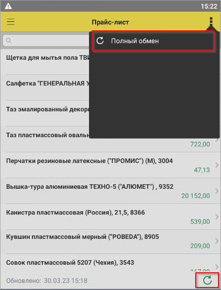 Откроется список товаров, ранее загруженных в приложение с ценами, по выбранному в настройке обмена виду цен.