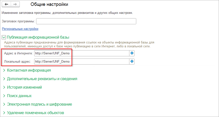 В эти поля следует вводить полный адрес публикации, состоящий из протокола (http или https), имени сервера (или его ip-адреса) и имени публикации, которое вы ввели в конфигураторе.