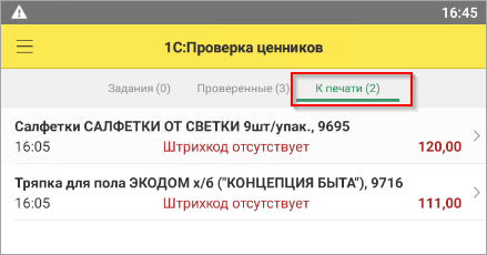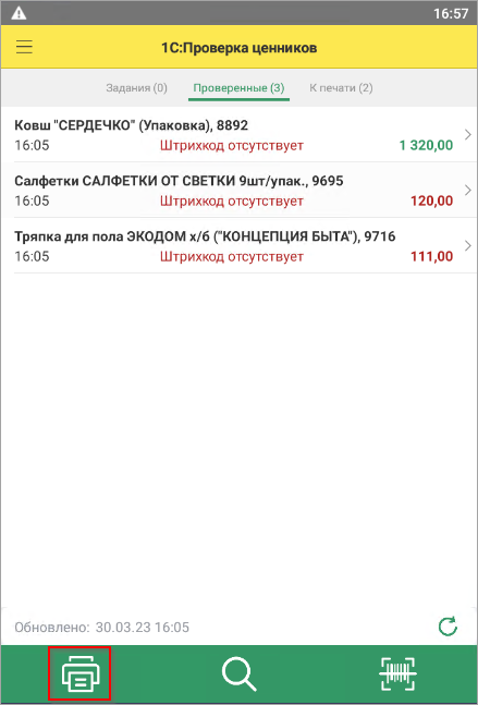 Если к приложению подключен принтер для печати ценников, то ценники с отметкой "Неправильный" отправляются на печать и далее перемещаются в историю сканирования, ценники с отметкой "Правильный" перемещаются в историю сканирования без печати.