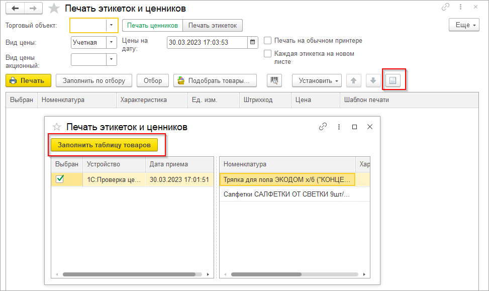 В открывшемся окне выберите пакет полученных ценников слева и нажмите "Заполнить таблицу товаров".