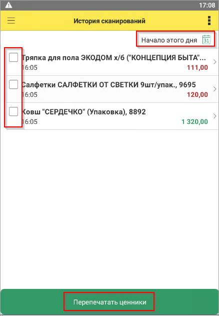 Выберите пункт "История сканирования" в основном меню приложения. В открывшейся форме отображаются ранее проверенные ценники и можно выбрать период для просмотра истории сканирования.