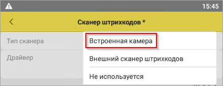 Также для считывания штрихкодов можно использовать встроенную камеру мобильного устройства: для этого выберите соответствующий пункт в поле "Тип сканера".